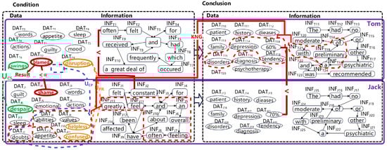 In Case 1, ’s unclear expression led to diagnostic differences. We map the (condition, conclusion) in SubExText to DIKWP, one by one, to find out the two main body expression texts (SubExText-T, SubExText-J) with the least . We first map SubExText-T, SubExText-J, SubExText-A, and SubExText-B(Condition, Conclusion) to DIKWP, respectively, and the “?” part that needs to be solved can be set as an x-band solver. The “?” part can be set to x for solving, and the specific process is as follows:
