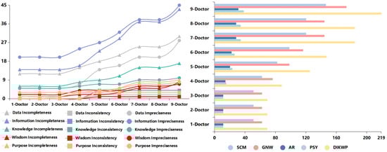In order to better validate the advantages of the DIKWP model in dealing with cognitive and diagnostic differences, four types of representative traditional methods for dealing with such problems (SCM, GNW, AR, and PSY) were selected for comparative analyses with our constructed model. SCM can only handle the case of and on data and information, GNW can only handle the case of and on data, information, and knowledge, AR can only handle the case of , as well as on knowledge, and PSY can only handle the case of on data and information, and on knowledge. In addition, we try to use qualitative and quantitative comparisons for the five methods. On the qualitative comparison, the five methods are analyzed and compared from the three levels of interpretability, dependence, and depth of analysis, and the case part of the content of the specific analytical description, the results show that the DIKWP model shows better advantages in these three levels. However, the qualitative comparison has a certain degree of subjectivity. Therefore, we conducted further analysis from the perspective of quantitative comparison by comparing the five methods, sentence-by-sentence, on (Figure 12), (Figure 13), where the sentence-by-sentence coverage rate on is more than 95%. Compared with the other four methods, the DIKWP model also presents the best results on uncertainty processing. As the number of interactive dialogues increases, the DIKWP model gradually widens the number of uncertainty processing problems compared to the other methods.