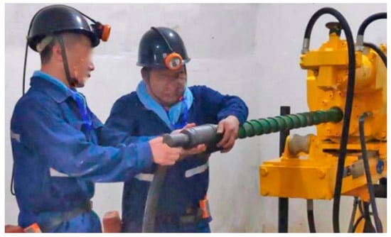 Detecting water is an important factor in safe production in coal mines. Mechanical water detection is recognized as the most reliable water detection technology, and its intelligent transformation is an inevitable development, in accordance with the development of science and technology, as well as the need for industrial development. At the beginning of the 21st century, Epiroc, Sandvik, Boart Longyear, and other companies entered a period of rapid development in drilling technology, developing the Smart ROC-Series intelligent drill with automated drilling holes, drilling bar loading, drilling, and other functions, the Pit Viper-Series automatic drill with remote control and automatic drilling bar switching functions, and the RDS Robot system drilling bar installation module, as shown in Figure 1. The method of using human-assisted installation and dismantling drilling bars means that the worker’s labor intensity is high, and people and machines working together can result in safety accidents [1]. An example of an artificial drilling operations scenario is shown in Figure 2. In 2019, China’s Coal Mine Safety Supervisory Authority published the “Coal Mine Robot Focus R&D Catalogue”, which requires that the water detector can be automatically installed and that drilling bar functions can be dismantled. In 2020, “the Guidelines on Accelerating the Intelligent Development of Coal Mines” clearly proposed raising the level of intelligence of coal mines to basic intelligence levels by 2025. The “14th Five-Year’ High Quality Development Guidelines for the Coal Industry”, issued in 2021, clearly proposed to significantly reduce the number of underground operators. China University of Mining and Technology and Harbin Institute of Technology jointly developed a drill robot that can automatically transport, install, and dismantle drilling bars. Chongqing Research Institute achieved fully automatic drilling of a drill Z through research and testing in the areas of automatic installation and dismantling drilling bars and automated drilling.