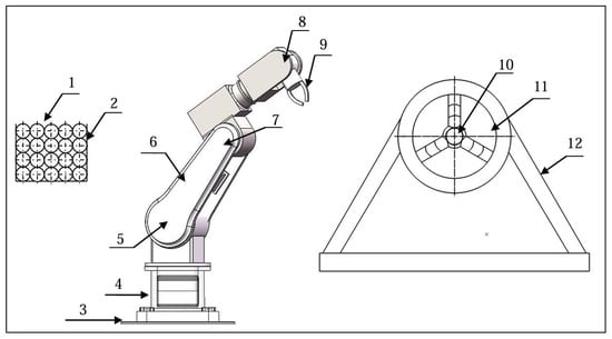 Illustration of drilling bars’ placement. 1—Drilling bars. 2—Storage rack. 3—Base seats. 4—Joint1. 5—Joint2. 6—Functional connector. 7—Joint3. 8—Joint4. 9—Mechanical tongs. 10—The front drilling bars. 11—Chuck. 12—Support frame.