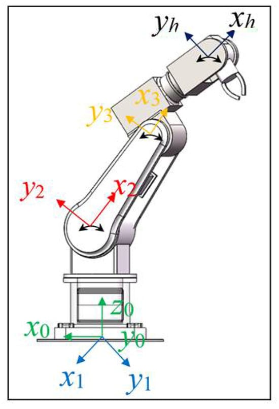 We preliminarily established the dynamic analysis model of the supplied material device by precisely defining its positional attitude. The supplied material device, formed by a series of functional connectors through the rotary joint, is a type of open-motion chain, and its characteristics comply with the MDH method [12]. Based on the above methods, the establishment of kinematic structural model was achieved, as shown in Figure 4. Based on the location of the rotary joint, four rectangular coordinates were established, with serial numbers of 0, 1, 2, and 3. The base coordinate corresponds to the 0 coordinate. The origin coordinate is at the bottom seat of the supplied material device, with the remaining three coordinates being the second and three rotary joints and the arm joints, respectively. The MDH coordinate model is shown in Figure 5.
