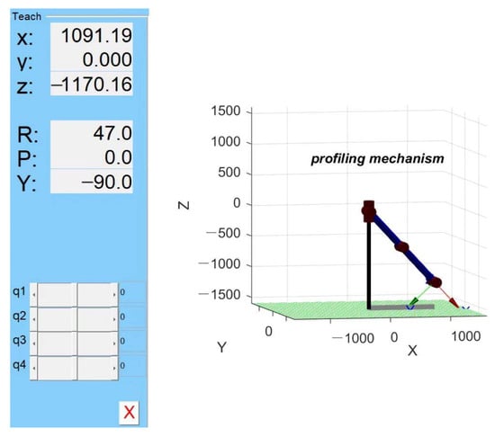 By substituting the D-H parameter values in Table 1 into Formula (1) for calculation, the coordinate transformation matrix from joint1 to joint4 of the profiling mechanism can be obtained as follows: