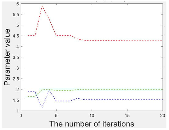 As shown in Figure 8, after 15 iterations, the PSO has found the global extremum, at which point the target function achieves the minimum value. As shown in Figure 9, the red line represents the c value; the green line represents the k value; and the blue line represents the ε value, so the controller parameters have reached the optimum: c = 4.27, k = 1.5, ε = 2.1.