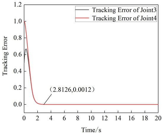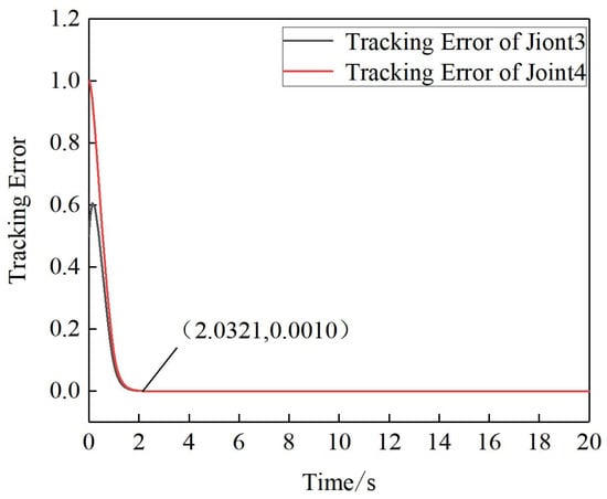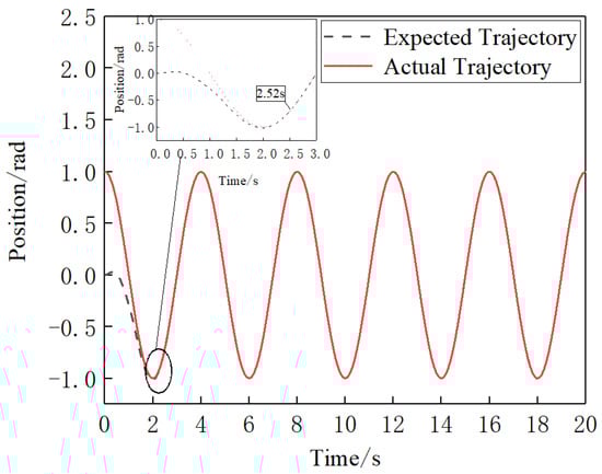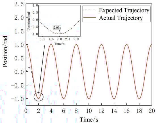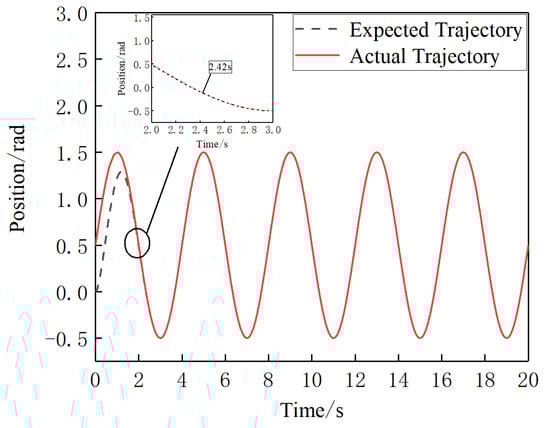 As shown in Figure 14, the sliding mold controller with the manually determined parameter traces the expected trajectory of joint4 in 2.52 s. As shown in Figure 15, after optimization of the controller parameter by PSO, joint4 traces the expected trajectory in 2.03 s under the control of that controller. It can be seen by comparing Figure 14 and Figure 15 that the new model controller improves the control of joint4 after optimizing its parameters by PSO, resulting in a 19.4% reduction in the time taken to trace the expected trajectory.