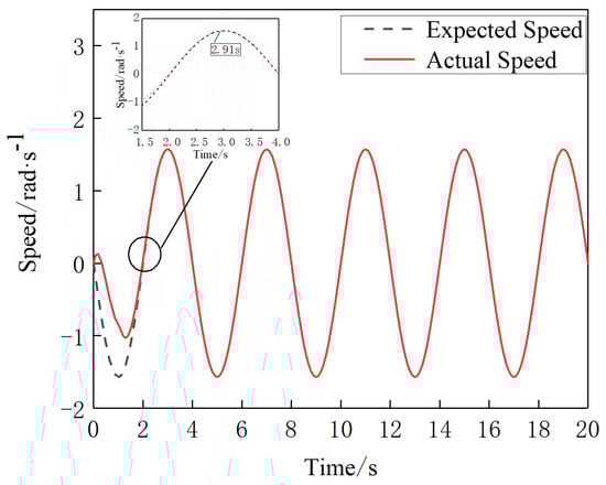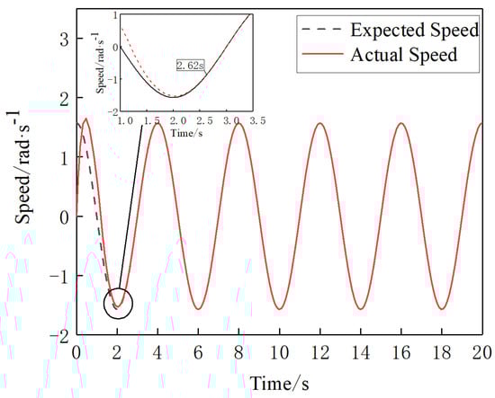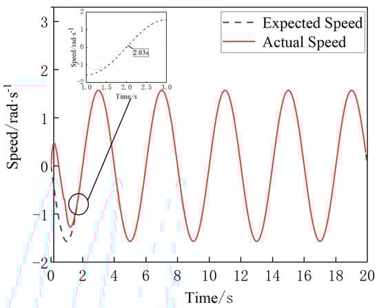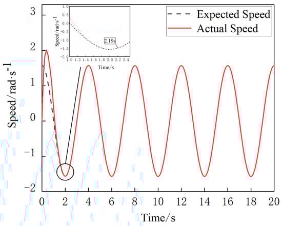 As shown in Figure 18, the sliding mold controller with the manually determined parameter traces the expected speed of joint4 in 2.91 s. As shown in Figure 19, after optimization of the controller parameter by PSO, joint4 traces the expected speed in 2.03 s under the control of that controller. It can be seen by comparing Figure 18 and Figure 19 that the new model controller improves the control of joint4 after optimizing its parameters by PSO, resulting in a 30.2% reduction in the time taken to trace the expected speed.
