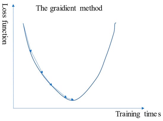The information transferred by back propagation is an error between the calculated data and the real data, which can be defined as the loss function with a minimum value. The smaller the error, the closer the predicted data are to the actual value. The process of continuously adjusting the weight , ,  is the back propagation by the gradient descent method. After the calculation, the original weight matrix is added to the gradient and the learning rate to obtain the new weight for the next calculation. The theory of the gradient descent method is shown in Figure 3.