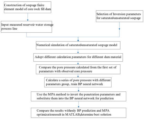 In this paper, an inversion method of the unsaturated seepage parameters of a core rockfill dam based on the MPA and a BP neural network is proposed. The flow chart is shown in Figure 4, and the process is described as follows: