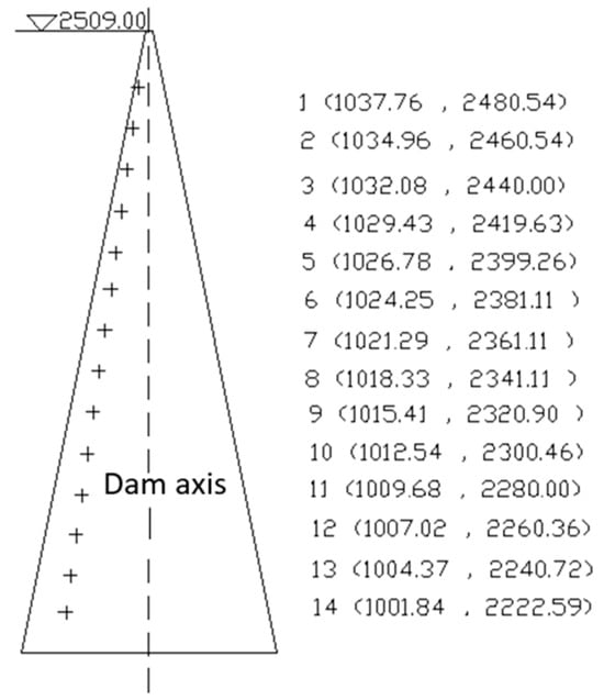 The model in Figure 5 of the actual dam and the sand layer is built as its actual size, the upstream and downstream ranges are each taken as 0.5 times the dam height, and the bedrock depth is twice the dam height. The calculation of the dam body pore water pressure is carried out in COMSOL 6.0 FEM software, which can accurately calculate the trend of the wetting line inside the dam body and the distribution of pore water pressure in the dam body. The meshing is shown in Figure 6. The distribution of measuring points in the core wall is shown in Figure 7.