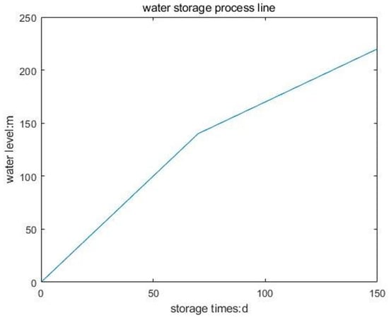 There are three stages for the initial water storage of the reservoir. The initial water storage speed is 2 m/d and lasts for 30 days, the mid-term storage speed is 2 m/d and lasts for 40 days, the late water storage speed is 1 m/d and lasts for 80 days, the total water storage period is 150 days, and the water storage elevation is 220 m. The water storage process line is as Figure 8: