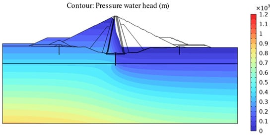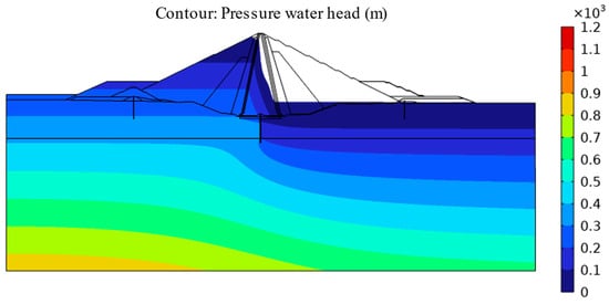 The objective function calculated by the permeability coefficient obtained by COMSOL–MATLAB is the minimum, which is 0.253. The distribution of the pore water pressure in the dam body is as Figure 11: