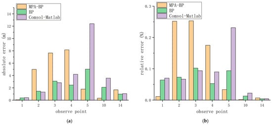 (1) In the first calculation condition, the BP artificial network algorithm shows better accuracy in terms of prediction results due to the large dataset for training; in some observed points, the other two methods have smaller errors. The mean error and variance of the absolute error of the BP artificial neural network algorithm are both the smallest, which are 2.21 m and 1.43 m, respectively. The mean error and variance of the relative error of the BP artificial neural network algorithm are both the smallest, which are 0.058 and 0.035, respectively. The mean error and variance of the absolute error of BP–MPA and COMSOL–MATLAB are 3.52 m, 3.15 m and 3.68 m, and 3.78 m. The mean error and variance of the relative error of BP–MPA and COMSOL–MATLAB are 0.105, 0.109 and 0.083, and 0.068. This shows that the second method may lead to fewer discrete errors, while the specific error may be abnormal.