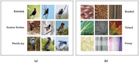 Texture is an important image characteristic in various fields [1,2]. In particular, texture provides meaningful cues for recognizing features in images [3,4]. To examine these characteristics, general object-based and texture-based datasets are compared with each other as follows: object-based datasets, such as ImageNet [5], CIFAR100 [6], and CUB-200-2011 [7], have been used to train the general model. Figure 1a shows examples of images from CUB-200-2011, in which images of 200 different objects were collected. For example, the first and third rows can be distinguished because Bobolink and Florida Jay have different characteristics. Similarly, during the training process, an object-based dataset can be used to determine the distinguishing characteristics between various objects and then classify those objects. However, in contrast to object-based datasets, texture-based datasets consist of unique image patterns. The classes in these datasets contain images that do not belong to the same objects. As shown in Figure 1b, which shows examples of images in the describable textures dataset (DTD) [8], most images in each class are made of the microparts of the objects, showing their material pattern.