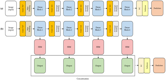 The structure of DenseNet is shown in Figure 2a. DenseNet has a DenseBlock comprising several layers. The input value of the previous layer was closely linked to that of the next layer using DenseBlock, allowing the feature information of the previous layer to be reused. DenseNet is also a model developed to preserve different levels of information compared to ResNet, which uses a skip connection technique to solve the gradient loss problem as the network deepens. Because of these structural characteristics, DenseNet is believed to be more helpful for extracting and utilizing detailed feature information about textures than general models such as VGG. The structure shown in Figure 2b is proposed based on the characteristics of DenseNet. The proposed model has a multiple-feature structure that can consider all features, from low to high levels, in the learning process. The output information generated for each DenseBlock is extracted using various features through each feature retention module (FRM). The generated output features are concatenated and used for the final classification. The values extracted and combined through the structure of this model contain features identified at each level, and preserved information. In addition, because these values are used through the structure proposed during learning, they can help one classify patterns of texture datasets with regularity and irregularity.