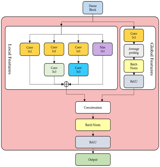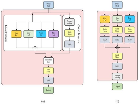 The structure of the proposed FRM is shown in Figure 3. The output value of each block was divided into local and global parts to extract the features. In the case of the local part, features were extracted and utilized through convolutions of various sizes. We used these convolutions based on the structural characteristics of the inception module presented in GoogleNet. Figure 4 shows two types of inception module structures. Figure 4a shows the inception module of the basic structure, and Figure 4b shows the dimension reduction. We refer to the structure presented in Figure 4b to obtain the calculation reduction effect and extract the characteristics of various convolutions. Three different filters were used as convolutional filters for extracting features 1 × 1, 3 × 3, and 5 × 5. In contrast to the max pooling of 3 × 3 in the inception module in Figure 4b, the max pooling of 1 × 1 was used to obtain more detailed information. Furthermore, each convolutional part had a convolution structure, batch normalization, and a ReLU. In the case of the global part, conv 1 × 1 was used as the value from DenseBlock for the effect of channel reduction, similar to the local part. A feature map was generated using average pooling to obtain the global characteristics of the output value of the block. Finally, the two values from local and global were concatenated to create a new output. The new output contained numerous meaningful features extracted from an image. Therefore, it is expected that extracting feature information through FRM for each output of DenseBlock can improve the model classification performance.