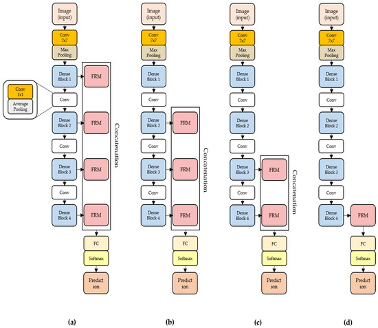 The output values of each DenseBlock were concatenated into four combinations to analyze the impact of multiple levels in various settings, as shown in Figure 6. As shown in Figure 6a, the output values of each DenseBlock are concatenated, and the feature information of all levels is used for learning. Subsequently, from Figure 6b–d, the structure of the model is constructed and learned by sequentially excluding the DenseBlock. Figure 6d shows a structure in which only high-level features were used. Additionally, each method commonly included the last DenseBlock, which outputted high-level features that significantly influenced classification performance. The learning results of the model learned in the four combinations are listed in Table 1, and the four combinations are sequentially listed in Table 1 as Blocks 14, 24, 34, and 4. The results from Blocks 14 to 4 showed that the structure of Block 14, used by combining all levels of output values, was more effective for learning than Block 4, which used only high-level output values. In other words, when using the proposed structure with the FRM, it was confirmed that the datasets with regularity and irregularity in the image were effectively classified. In addition, the proposed method on the KTH-TIPS2b dataset with regularity within classes was effective in terms of performance.