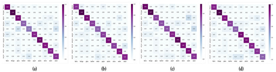 (a–d) show the confusion matrix of Blocks 14, 24, 34, and 4 on FMD, respectively. In the confusion matrix, the y-axis and x-axis denote actual class and predicted class, respectively.