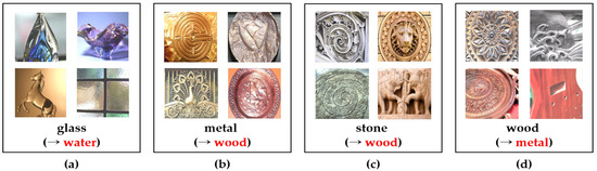 Examples of images in FMD for a class selected according to the result of the confusion matrix. (a–d) mean class glass, metal, stone, and wood examples, respectively. The black letter below the image indicates actual class, and the red letter indicates predicted class by the proposed model.