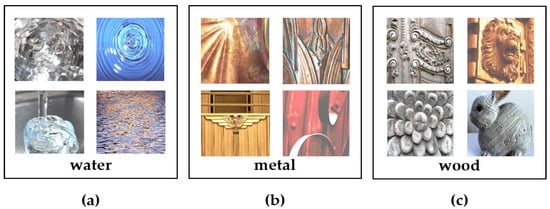 Examples of class images in FMD. (a–c) are class water, metal, and wood examples, respectively.