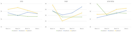 We compared the performance of the FRM with that of the changed modules, as shown in Figure 10. Table 3 lists the results of the three methods for the texture datasets. Method 1 denotes the case in which the proposed FRM is used, as shown in Figure 3. Methods 2 and 3 refer to the combination of the modified modules proposed in Figure 10a and Figure 10b, respectively. The blocks mentioned in each method refer to the structural forms shown in Figure 6. Method 1 was demonstrated to be effective using the proposed method with the FRM, as described in Section 4.3. Method 2 exhibited high performance when using high-level features across the entire dataset. Method 3 performed well when several levels were used in DTD and FMD, whereas it performed better only at high levels in KTH-TIPS2b. A comparison of the performance results for all methods is shown in Figure 11. Overall, the results for the DTD showed the highest performance of 75.50% when Block 24 in Method 3 was used. In the FMD results, Block 14 in Method 3 was the highest at 83.79%. Block 14 in Method 1 for KTH-TIP2b exhibited a performance of 92.97%. In addition, improvements of 0.85% and 0.57% were observed for Block 4 in Methods 2 and 3, respectively.