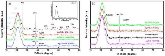 The XRD patterns of TiO2 and Ag/TiO2 films with different sputtering power and times of Ag are shown in Figure 1a. The diffraction peaks at 25.1°, 37.7°, 47.9°, 53.8°, 55.0°, and 62.5° correspond to the characteristic planes (101), (004), (200), (105), (211), and (204) planes of TiO2 (JCPDS No. 21-1272), respectively [21,22]. The results demonstrate that TiO2 film has an anatase structure. The diffraction peaks at 38.0° and 44.1° correspond to the (111) and (200) crystal planes of Ag (JCPDS Card 01-1164), respectively. When the sputtering time of Ag is 100 s, with the increase in the sputtering power of Ag, the diffraction peak intensity of TiO2 decreases gradually; the diffraction peak intensity of Ag also increases gradually, which indicates that the Ag deposited on the surface of TiO2 film increases gradually with the increase in the sputtering power of Ag, shown in Figure 1a. The XRD patterns of Ag/TiO2 thin films with a sputtering power of 5 W and different sputtering times for Ag are shown in Figure 1b. The diffraction peaks appear at 25.1° corresponding to the (101) plane of anatase TiO2, at 38.0° and 44.1° corresponding to (111) and (200) crystal planes of Ag, respectively. With the increased sputtering time of Ag, the diffraction peak intensity of TiO2 decreases gradually and the diffraction peak intensity of Ag increases gradually, as shown in Figure 1b. When the sputtering power and the sputtering time of Ag are 5 W and 150 s, respectively, the diffraction peak of TiO2 is very weak. The intensity of the diffraction peak of Ag/TiO2-5 W-150 s at 38.0° and 44.1° is stronger than that of Ag/TiO2-15 W-100 s. These results show that the Ag deposition on the TiO2 surface increases rapidly with increasing sputtering time.
