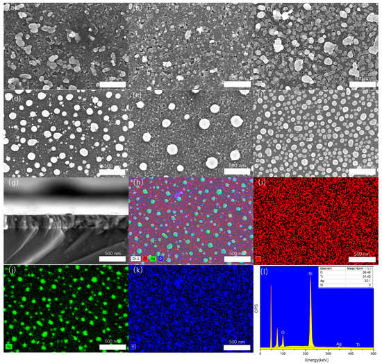 SEM images and mapping of elemental analyses of TiO2 (a), Ag/TiO2 (b), Ag/TiO2-5 W-50 s, (c) Ag/TiO2-5 W-100 s, (d) Ag/TiO2-5 W-150 s, (e) Ag/TiO2-10 W-100 s, and (f) Ag/TiO2-15 W-100 s; (g) cross-section of TiO2; (h–k) EDS mappings of Ag/TiO2-5 W-150 s; and (l) EDS point analysis of Ag/TiO2-5 W-150 s films.