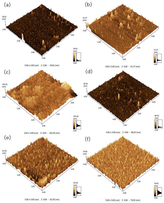 The 3D surface topographies and roughness of films are studied via AFM in Figure 3 and Table 1. It is seen that the 3D surface topographies of all samples are columnar structures. Figure 3a shows the 3D surface topography of TiO2; it can be seen that the TiO2 nanoparticles are uniformly dispersed on the entire substrate surface. When Ag with a power of 5 W and a sputtering time of 50 s is used for the surface modification of TiO2, the average diameter of the columnar structure is the smallest in Figure 3b. The maximum constructive height is 102.26 nm corresponding to the Ag/TiO2-5 W-100 s film in Figure 3c. With the increase in the sputtering time of Ag, the constitutive height of the Ag/TiO2-5 W-50 s film as shown in Figure 3b first increases from 41.27 nm to 102.26 nm of Ag/TiO2-5 W-100 s film, shown in Figure 3c, and then decreases to 80.42 nm of the Ag/TiO2-5 W-150 s film, shown in Figure 3d. With the increase in the sputtering power of Ag, the constitutive height of Ag/TiO2-10 W-100 s film shown in Figure 3e first decreases to 63.29 nm from 102.26 nm of Ag/TiO2-5 W-100 s, shown in Figure 3c, and then increases to 70.92 nm of Ag/TiO2-15 W-100 s film, as shown in Figure 3f.