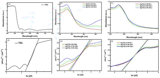 UV-Vis DRS of (a) TiO2, (b) Ag/TiO2-5 W-100 s, Ag/TiO2-10 W-100 s, and Ag/TiO2-15 W-100 s photocatalysts; (c) Ag/TiO2-5 W-50 s, Ag/TiO2-5 W-100 s, and Ag/TiO2-5 W-150 s photocatalysts; Tauc plots obtained for (d) TiO2 photocatalysts, (e) Ag/TiO2-5 W-100 s, Ag/TiO2-10 W-100 s, and Ag/TiO2-15 W-100 s photocatalysts; and (f) Ag/TiO2-5 W-50 s, Ag/TiO2-5 W-100 s, and Ag/TiO2-5 W-150 s photocatalysts.