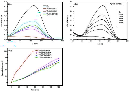 The photocatalytic activity of Ag/TiO2 and TiO2 was investigated by measuring the UV-Vis spectra of MO solution after the photocatalytic degradation reaction under the same conditions. Figure 5a shows the UV-Vis absorption spectra of MO before (Co) and after photocatalytic degradation through Ag/TiO2 and TiO2 in pure MO solution. The results suggest that the photocatalytic effect is the best when the sputtering power is 5 W and the sputtering time of Ag is 50 s. Figure 5b shows UV-Vis absorption spectra of MO solution with an initial concentration of 10 mg L−1 under different illumination times during the photocatalytic degradation of MO using Ag/TiO2-5 W-50 s in pure MO solution. Figure 5c shows the degradation rate of MO solution via Ag/TiO2 modified using Ag with different sputtering power and sputtering times of Ag in pure MO solution. It demonstrates that the degradation rate of MO solution using Ag/TiO2-5 W-50 s can reach 100% within 55 min. The results also indicate that although the redshift of Ag/TiO2-5 W-50 s is not as significant as that of Ag/TiO2 using the high-power and long-time sputtering of Ag, small particles of Ag can help to improve the separation of photogenerated electron–hole pairs, thereby enhancing the degradation effect. The main reason for this phenomenon may be (1) the interface between Ag nanoparticles deposited on the TiO2 surface and TiO2 nanoparticles, forming a Schottky barrier that enables the continuous migration and enrichment of photogenerated electrons to Ag particles, and facilitates the separation of electrons and holes, thus improving the photocatalytic activity [29,30]; (2) the Ag nanoparticles on the TiO2 surface, causing the electron cloud density on the TiO2 surface to decrease, which facilitates the adsorption of O2 on the (101) crystal surface of anatase TiO2, allowing the photogenerated electrons to react with more O2 to form reactive substances, such as ·O2−, ·OH, etc., thereby further increasing the catalytic activity of the catalysts [27,28]; (3) or that Ag/TiO2-5 W-50 s has a strong adsorption effect on organic compounds (e.g., MO) containing N and S functional groups, and in the oxygen-enriched state (O2 adsorption from the crystal surface of anatase TiO2(101)), the connection between MO and TiO2 is in the form of S-O bonds [31].