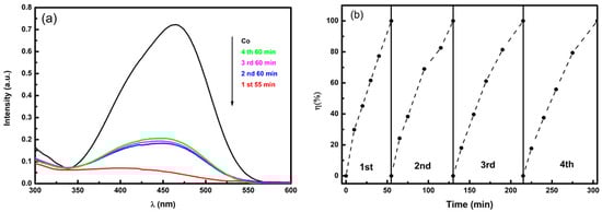 The luminous group of MO is a nitrogen-conjugated double bond. In the experiment, the value of the characteristic peak decreased over time, indicating that the concentration of MO gradually decreased. After the photocatalytic reaction reached equilibrium, the recycled photocatalyst was immersed in water and no dye color was found. This indicates that the degradation reaction is mainly photocatalytic degradation, and the dye molecules are degraded through photocatalysis rather than adsorption.
