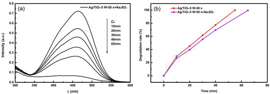 Figure 7a shows the time-dependent optical absorption spectra of MO with an initial MO concentration of 10 mg/L and Na2SO4 concentration of 12.5 g/L in the mixture solution of MO-Na2SO4 before and after photocatalytic degradation with Ag/TiO2-5 W-50 s. It can be found that the degradation of pure MO in pure solution was completed in 55 min, and the degradation rate of MO can reach 100% while the degradation rate of MO in MO-Na2SO4 mixed solution can reach 100% in 65 min, as shown in Figure 7b. By comparison, it can be found that the degradation effect of MO in pure MO solution is better than that in MO-Na2SO4 mixed solution. The results suggest that Na2SO4 has an inhibitory effect on the degradation of MO. The possible reason may be one of the following: (1) When Na2SO4 is added to the MO solution, the pH value of the solution increases. The photocatalytic degradation efficiency of Ag/TiO2 at low pH is higher than that at high pH due to the fact that MO is an anionic molecule and positively charged photocatalyst surfaces are more likely to absorb dye molecules. The dye structure of MO was prone to oxidation over the azo structure as the sulfonic groups (-SO4−) can help capture hydrogen protons and further enhance the hydrophobicity of the TiO2 surface [34,35]. (2) When Na2SO4 is added to the MO solution, the saturation adsorption amount may decrease due to the competition adsorption of anions added (SO42−) and anion dye molecules onto the surface of TiO2, which inactivates part of the catalyst and reduces the degradation efficiency [36,37,38,39]. (3) SO42− is adsorbed on the surface of the photocatalyst, acting as a pore-trapping agent to increase the content of SO4−· generated, which accelerates the oxidation of Ag and increases the recombination rate of photogenerated electron–hole pairs. This speculation can be supported by the XPS results in the following text.