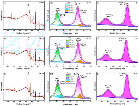 XPS spectra of Ag/TiO2-5 W-50 s film before photocatalytic degradation of MO: (a) overall spectrum, (b) Ag 3d, and (c) Ti 2p; Ag/TiO2-5 W-50 s film after the photocatalytic degradation of MO in pure MO solution: (d) overall spectrum, (e) Ag 3d, and (f) Ti 2p; Ag/TiO2-5 W-50 s film after the photocatalytic degradation of MO in MO-Na2SO4 solution: (g) overall spectrum, (h) Ag 3d, and (i) Ti 2p.