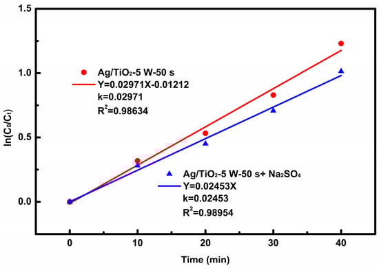 where t is the irradiation time, (mg L−1) and (mg L−1) are the same as those in Equation (1), and k is the pseudo-first-order rate constant (min−1). In the experiments, the photocatalytic degradation efficiency for MO was represented by the initial k. The initial k was obtained using experimental data up to 40 min of the simulated irradiation because the subsequent data seemed to deviate from the linear plot of ln (C0/Ct) vs. t, owing to the decreasing MO concentration in the bulk solution. The linear regression coefficient R2 of Ag/TiO2-5 W-50 s and the initial rate constant k in the pure MO solution were 0.98634 and 0.04543 min−1; meanwhile, in the MO-Na2SO4 solution, the linear regression coefficient R2 was 0.98954 and the initial rate constant k was 0.03609 min−1, as shown in Figure 9. Apparently, the linear regression coefficients of both were close to 1, which suggested that the pseudo-first-order kinetic was suitable for describing the kinetics of MO photodegradation; the photocatalytic process was a concentration-controlled reaction rate. And, the k value in the MO solution is larger than that in MO-Na2SO4, so the photocatalytic degradation efficiency of MO using Ag/TiO2-5 W-50 s in the pure MO solution is better than that in the MO-Na2SO4 solution. The results are consistent with those in Figure 7b.
