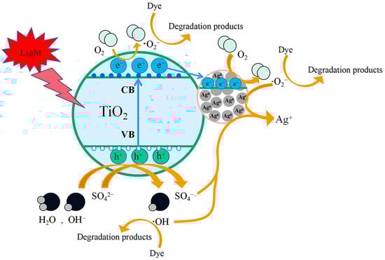 Figure 10 shows the schematic diagram of the photocatalytic degradation mechanism of Ag/TiO2. Under UV irradiation, the photogenerated electrons in the TiO2 conduction band migrate to Ag, forming electron–hole pairs. Consequently, a Schottky barrier is formed at the Ag-TiO2 interface, acting as an electron trap. As a result, the electron capture sites on Ag inhibit the recombination of e− and h+, causing more residual h+ in the TiO2 valence band to oxidize H2O on the membrane surface, generating ·OH and increasing the ·OH concentration, thereby promoting the oxidative decomposition of MO. Simultaneously, the e− captured on Ag can independently transfer to the adsorbed oxygen on the membrane surface, producing O2−, which also facilitates the degradation of MO [46]. While a large amount of SO42− appeared in the solution after the addition of Na2SO4, SO42− was adsorbed on the surface of the photocatalyst, acting as a pore-trapping agent to increase the generated content of SO4−·; both ·OH and SO4−· can make the Ag0 on the surface of the catalyst oxidize to Ag+, leading to the decrease in the degradation efficiency of the photocatalyst in the solution of MO-Na2SO4 [34].