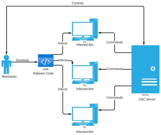 A botnet is defined as a network of infected computers that perform malicious activities, such as information theft, performing DDoS, sending spam, and so on. Botnet architecture is shown in Figure 1. It consists of a botmaster, bot clients, C&C communication protocols, and a C&C server [].