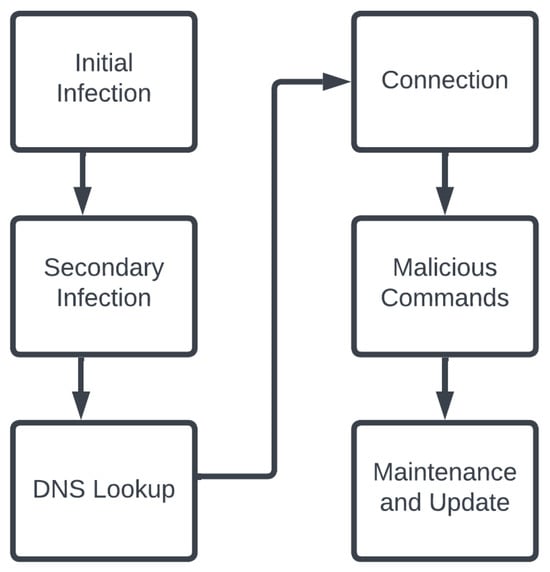 The botnet life cycle is shown in Figure 2. It consists of multiple phases, including initial infection, secondary infection, connecting to C&C servers, rallying, malicious commands, and maintaining/updating the malware [].
