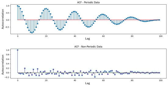 Autocorrelation analysis is used to calculate and quantify the relationship of time series data points between distinct instances of time to detect a trend. It is used to find similarities with itself after specific time intervals []. The autocorrelation formula to calculate the correlation between the current data and data lagged by k units is as follows: