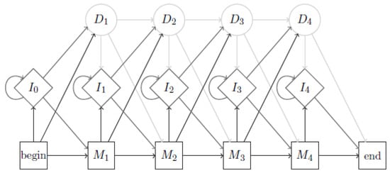 Profile Hidden Markov Models (PHMMs) are also statistical models and an extension of HMMs, where we can view PHMM as a series of HMMs. The training of a PHMM involves several steps, like creating multiple sequence alignment (MSA) using the training sequences. Every column in the alignment is used to generate a score corresponding to each position. The PHMM has three states—match, insert, and delete states. Insert and delete states are used for the gaps in aligned sequences. The assignment of transition probabilities is performed to identify dependencies between adjoining positions []. Table 2 consists of the standard notation for PHMM, while Figure 5 depicts its model. Additional details can be found in [].