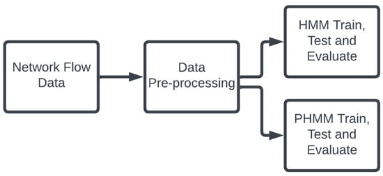 The objective of this work was to categorize network flow data as either botnet activity or normal activity and, further, to classify botnets into the seven families (Neris, RBot, Virut, DonBot, Sogou, Murlo, and NSIS.ay) present in the CTU-13 dataset. The proposed methodology involved feature extraction and training a Hidden Markov Model (HMM) and a Profile Hidden Markov Model (PHMM) to accurately classify unknown data. The process comprised two main phases: data pre-processing and model training with evaluation. The former involved extracting meaningful features from the 15 available attributes mentioned in Table 4. The latter encompassed training, testing, and evaluating the HMM and PHMM models. Figure 6 provides an overview of the overall implementation process.