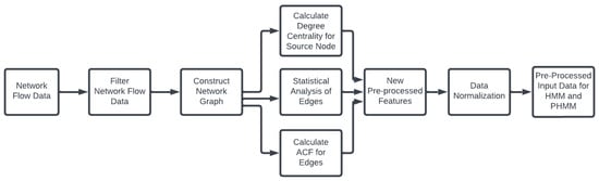 The data pre-processing phase consists of multiple steps, including filtering network flow, creating a network graph, deriving statistical data from the graph, calculating autocorrelation from edges, determining the degree centrality of the source node, and normalizing the data. Additionally, for the PHMM, a binning step is required to convert data into alphabetical strings, forming sequences in multiple sequence alignment (MSA) format. These sequences are stored in FASTA format for PHMM input. Figure 7 outlines the common data pre-processing steps required for both the HMM and PHMM.