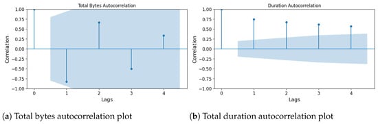 - Extracting autocorrelation features from network graph. Autocorrelation features are calculated for attributes such as Dur, TotPkts, and TotBytes. Periodicity and strength of autocorrelation are determined, resulting in 9 new autocorrelation features. Figure 9a,b illustrate the periodicity observed in total bytes and duration, respectively.
