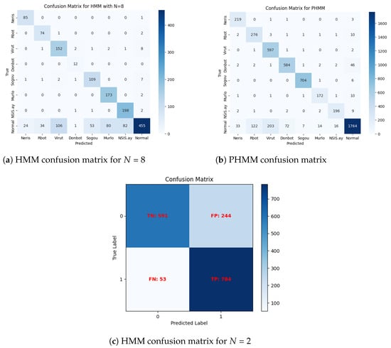 Table 7 presents the model evaluation for N = 8. The highest accuracy was achieved for Donbot, followed by Neris. This could be attributed to the larger number of botnet data samples present in the dataset. The lowest accuracy was observed for the detection of normal traffic. Figure 10a displays the confusion matrix for multiclass classification for HMM. The test data consisted of 835 normal traffic samples and 837 botnet samples. Although the botnets were classified effectively, the classification of normal traffic was not as successful. This could be due to the greater diversity and variability in normal network traffic, which is influenced by factors such as different protocols or user behavior. In contrast, botnet traffic tended to exhibit similar patterns. Table 8 presents the model evaluation for N = 2, and Figure 10c shows the corresponding confusion matrix.