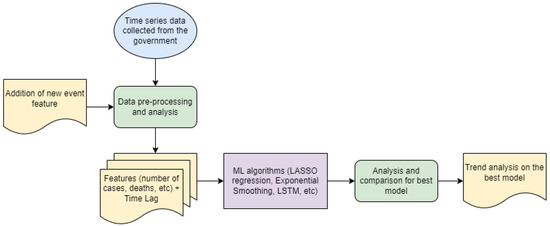 This section describes the methodology used for forecasting COVID-19 cases. Section 3.1 presents the machine learning models used for pandemic forecasting. Section 3.2 presents the evaluation metrics. Section 3.3 discusses the model selection. Section 3.4 and Section 3.5 present a thorough description of the data used as a part of the case study on the UAE and some preliminary data analysis, respectively. Figure 1 describes the workflow of the study.