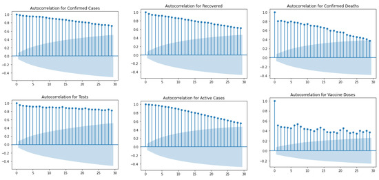 Before the data can be fed into the machine learning models, certain analysis needs to be done so as to understand the behavior of the time series. Time series data can have trends only if a certain pattern in the data repeats itself on regular intervals of time due to any external factors and is not random; therefore, we need to test the quality of the given dataset such that it consists of a trend in which we can analyze. For this, autocorrelation plots are derived to determine whether the elements of the time series are random or not. Autocorrelation determines the similarity between a certain data point and its past within a time interval called lag. As seen in Figure 5, the horizontal axis shows the lag between two elements, so, for example, a lag of 2 means values observed two time periods earlier than the current observation. The vertical axis shows the results of the autocorrelation function and ranges from −1 to 1, where a value from −1 to 0 is a negative correlation and a value from 0 to 1 is a positive relation [39]. Any value closer to 1/−1 means a higher level of correlation. Figure 5 shows the autocorrelation plots for each of the attributes. The autocorrelation with lag 0 will always be 1 as it is the autocorrelation between itself and can be ignored. As all the spikes are above zero, they are statistically significant which means that all the values are highly correlated and signifies that when the values of the trend are rising, it will continue to rise with time and when the values of the trend are falling, they will continue to fall. Hence, the time series can be considered as not random but following a significant trend.