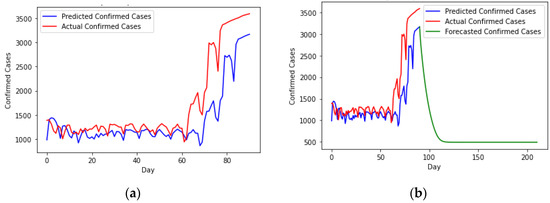 Prediction of cases based on the univariate trend using the LSTM on (a) testing set (b) Predicting beyond the test set.