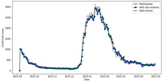 The following Figure 11 illustrates the way the LSTM worked on the other variations of the dataset. From this, we could infer that the model works moderately well with the addition of the Confirmed Cases, Deaths, and Recoveries attributes, except for a few areas marked on the Figure where the model gets the values slightly wrong (b), although one would think that the addition of the Recovered Cases and Deaths attributes should help improve the model as they correlated to each other, as seen in Figure 3. This could be because in the UAE dataset, deaths are almost constant, and this might cause a confusion to the trend. With the addition of the Vaccination attribute, the effect of the Recovered Cases and Deaths attributes on the final prediction is reduced but is still not as good as the univariate case (d). This can show that there might be a slight relation between the Vaccination attribute and the others, but the actual values may not be truly helpful. Finally, the case with the additional event-related variables is tested. Unlike the previous Vaccinations case, the model is slightly more stable with an R2 score of 0.85, as seen in Table 7. This proves that the additional variables help the model learn the trend. Although it does work well, there is still room for improvement. This could be because the variables are simply 1 or 0 for whether an event was there or not on the day. Not enough information about the effect of the events is transferable through these simple variables.