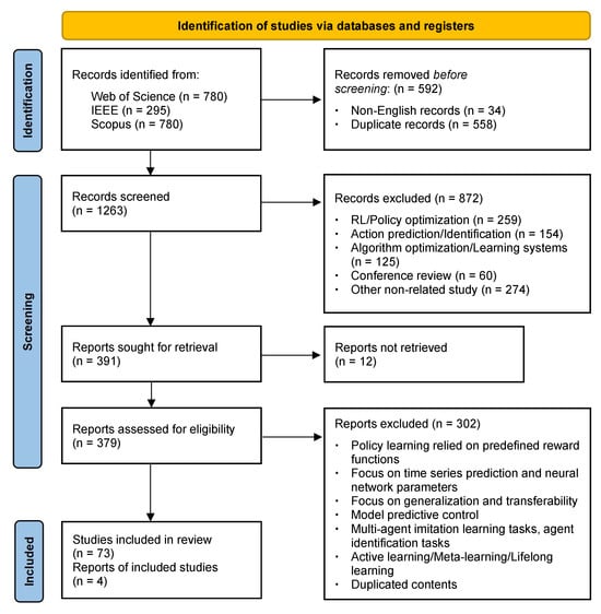 In the literature screening phase, 872 results were removed based on titles and abstracts. The main topics of these studies were RL, action recognition, and algorithm optimization, which are not discussed in this review. Among these, 12 records could not be retrieved and were therefore excluded. In the full-text eligibility assessment phase, we preferred strategy learning approaches based on behavioral data-driven methods rather than manually designed reward functions, neural network-based predictions, or model predictive control. Additionally, this review focused on learning single-agent behavioral strategies and did not discuss multi-agent interactive behavioral strategies. In addition, the topics in this review did not engage in active learning, meta-learning, or lifelong learning; thus, 302 records were excluded. In total, 77 articles were used for the systematic evaluation. The overall framework of this review is shown in Table 1. In addition to the literature under review, some of the early classic works are also mentioned in the text.