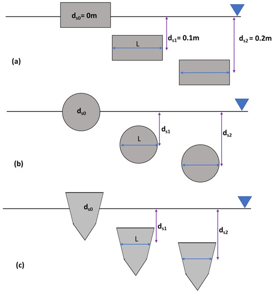 Schematic representation of floating (ds0 = 0 m) and submerged (ds1 = 0.1 m, ds2 = 0.2 m). (a) Rectangular box (W1). (b) Circular cylinder (W2). (c) Trapezoidal fin (W3).