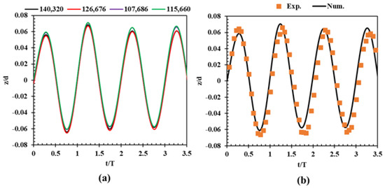 The numerical results were validated using experimental data published in [11], considering the same wave height, rectangular buoy, and numerical wave tank. The effective density of the rectangular floating buoy considered is 500 kg/m3. A mesh independence study was carried out by plotting the dimensionless vertical displacement (z/d) as a function of the dimensionless time (t/T) obtained for meshes comprising 107,686, 115,660, 140,320, and 126,676 cells; see Figure 3a.
