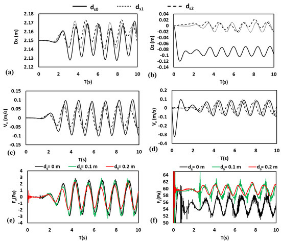 Figure 4a displays the horizontal displacement Dx of W1 at all three submergence depths. This horizontal displacement is lower at ds2 = 0.2 m. The vertical displacement Dz of W1 is shown in Figure 4b. W1 is seen to initially fall at ds0 = 0 m because of an unbalanced buoyancy force without spring support. After 3 s, the vertical movement of the WEC becomes stable. The heave motion (Dz) is thus stable, with a higher amplitude value at ds0 and ds1 than at ds2.