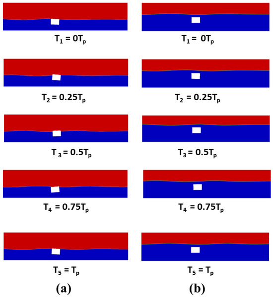 Contour plots showing the interaction between the waves and W1 (blue color: water; red color: air). (a) ds0 = 0 m. (b) ds2 = 0.2 m. Time period Tp = 1.2 s, wave height H = 0.04 m, and k2 = 50 N/m.